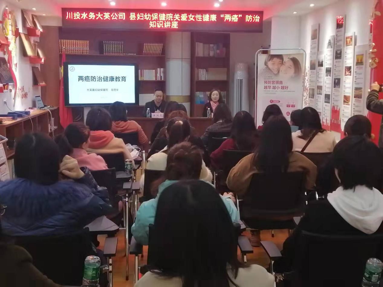 為切實維護廣大女性同胞的身心健康,提高全體女干部職工的健康保健意識。在“三八”國際勞動婦女節(jié)來臨之際,3月4日上午,川投水務(wù)大英公司黨支部、工會與大英縣婦幼保健院聯(lián)合舉辦關(guān)愛女性健康“兩癌”防治知識健康講座主題活動。公司全體女黨員干部職工參加,大英縣婦幼保健院院長龍艷華主講,川投水務(wù)大英公司副總經(jīng)理、工會主席王洪先同志受公司黨支部書記、總經(jīng)理王文川同志委托出席并主持講座。