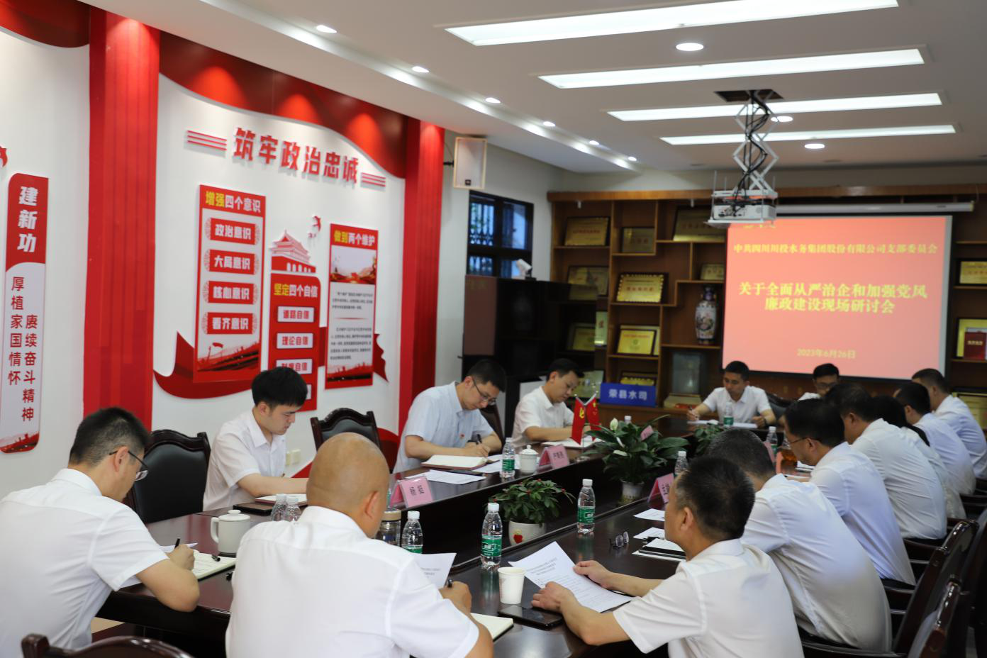 6月26日,為全面貫徹落實從嚴(yán)治黨主體責(zé)任,深入推進基層黨風(fēng)廉政建設(shè)工作,川投水務(wù)集團黨委委員、副總經(jīng)理嚴(yán)斯亮同志帶領(lǐng)調(diào)研小組赴榮縣水司開展“全面從嚴(yán)治企和加強黨風(fēng)廉政建設(shè)”現(xiàn)場專題調(diào)研會,榮縣水司領(lǐng)導(dǎo)班子成員、中層副職以上及群眾代表共計14人參加會議。