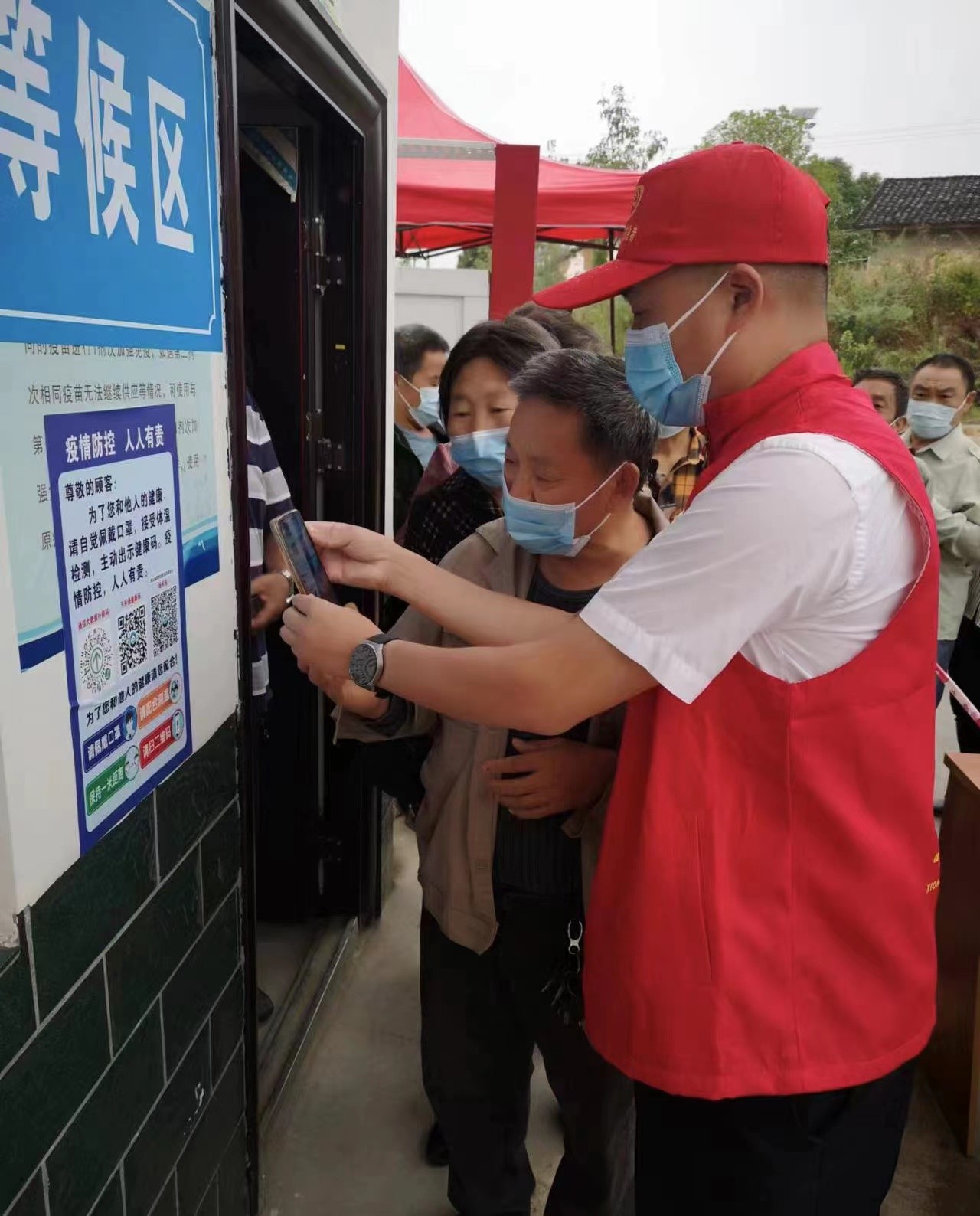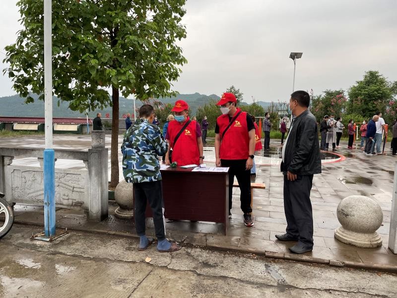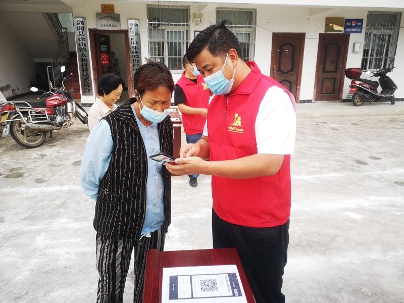 隨著人流量不斷增加,隊員們又主動承擔起維持秩序、引導掃碼測溫等工作?!罢埬鷰Ш每谡?,出示行程碼,掃場所碼!”由于農(nóng)村地區(qū)老年人居多,對核酸檢測程序不了解,隊員們不厭其煩地一遍又一遍地重復著引導語。有的老年人沒有智能手機或者不會使用,他們又主動幫助其核實身份信息、綁定“天府健康通”APP等等,讓采樣過程更加流暢,效率大大提高。經(jīng)過一天的努力,涂山鎮(zhèn)全域全員核酸采樣完成,無一人漏檢。