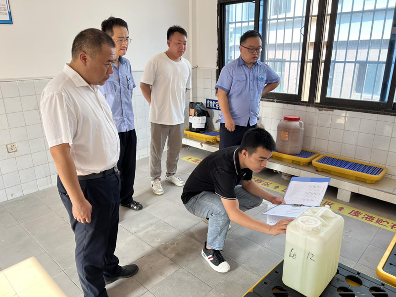 首先,劉總一行前往生產(chǎn)一線實地查看生產(chǎn)廠區(qū)、環(huán)檢公司等區(qū)域,重點檢查危廢暫存間是否落實“一物一碼”要求,化驗藥品出入庫臺賬等情況,同時查閱了危廢和污泥處置合同、轉(zhuǎn)運聯(lián)單等相關(guān)資料。