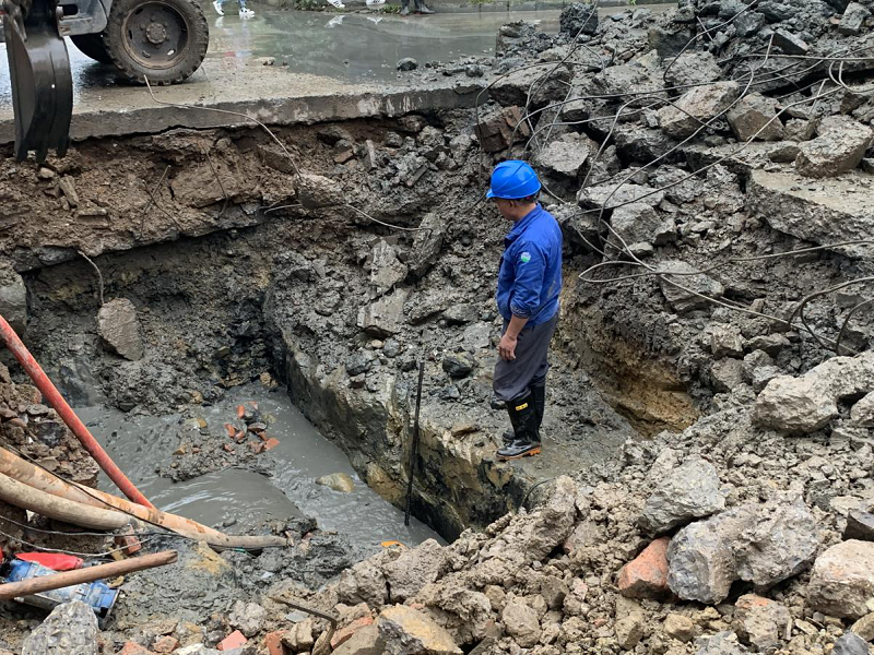 由于積水沿管線和四周持續(xù)外冒,漏點(diǎn)定位難度極大,應(yīng)急搶修人員首先劃定警戒區(qū)域,調(diào)度挖掘機(jī)破碎路面。同時(shí)領(lǐng)導(dǎo)班子研判:若要徹底排查并修復(fù)管道,必須關(guān)閉出水總閘,暫??h城區(qū)供水,但考量到停水將影響近20萬(wàn)居民用水,公司搶修人員先帶水作業(yè),查看漏點(diǎn)情況。公司按流程將情況上報(bào)縣委縣政府、各主管部門及水務(wù)集團(tuán),同步啟動(dòng)信息發(fā)布與輿情管理工作。