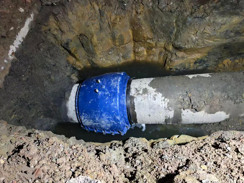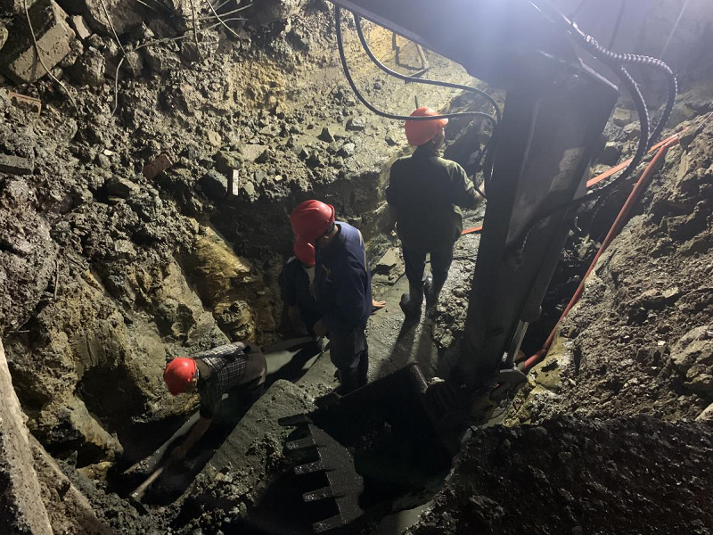 現(xiàn)場(chǎng)立即安排人員前往庫(kù)房調(diào)取專用搶修物資——8月定制的DN800球墨鑄鐵搶修節(jié)。又因取水主管底部及周邊被完整巖石包裹,機(jī)械開(kāi)挖無(wú)法繼續(xù),作業(yè)方式緊急轉(zhuǎn)為人工開(kāi)挖,6名作業(yè)人員在狹窄空間內(nèi)佝僂身體,持續(xù)挖掘直至晚上10時(shí)30分,終于開(kāi)辟出合格作業(yè)面。隨后,施工人員用機(jī)械將搶修節(jié)運(yùn)送至作業(yè)點(diǎn),反復(fù)調(diào)整角度確保與管道精準(zhǔn)匹配,最終在10月22日凌晨2時(shí)21分完成全部搶修作業(yè)。