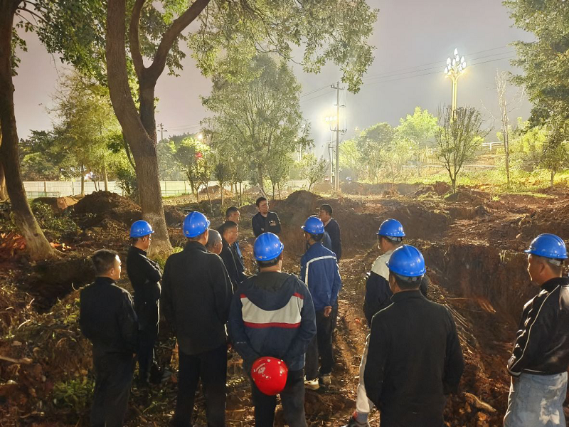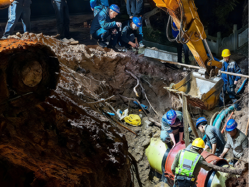 隨后,朱禹迅速按照預(yù)案,成立由其本人擔(dān)任組長、班子其他成員任副組長,工程技術(shù)部、綜合管理部、客戶服務(wù)中心、供水部等部門負責(zé)人及技術(shù)骨干為成員的搶險指揮部,并下設(shè)兩個搶險小組:第一組由公司常務(wù)副總經(jīng)理秦榮負責(zé),承擔(dān)中金快通興隆鎮(zhèn)凱歌大道中段供水主管的搶修任務(wù);第二組由公司副總經(jīng)理杜剛、高峰共同負責(zé),承擔(dān)繼光水廠DN700出水母管的搶修任務(wù)。指揮部確定了 “先控險、再修復(fù)、保民生、兩線同時作戰(zhàn)”的搶險總思路,并立下 “28日早上9時前恢復(fù)縣城區(qū)正常供水”的硬性目標。各部門職責(zé)清晰細化:工程技術(shù)部主攻現(xiàn)場搶修,綜合管理部負責(zé)信息發(fā)布,客戶服務(wù)中心對接用戶溝通,供水部負責(zé)供水調(diào)度,全體人員隨即進入“戰(zhàn)時狀態(tài)”,全時輪班投入搶險工作中。